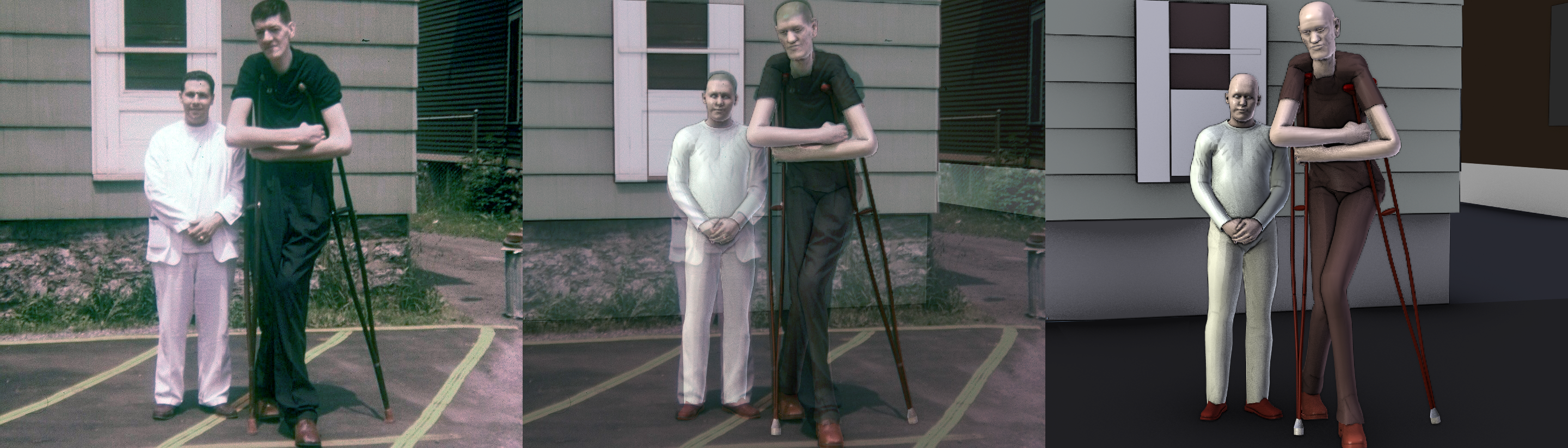 Fig 9. Illustration showing the transition from the 2D photograph and to a 3D scene of Carroll’s crutches. Click on image to view larger