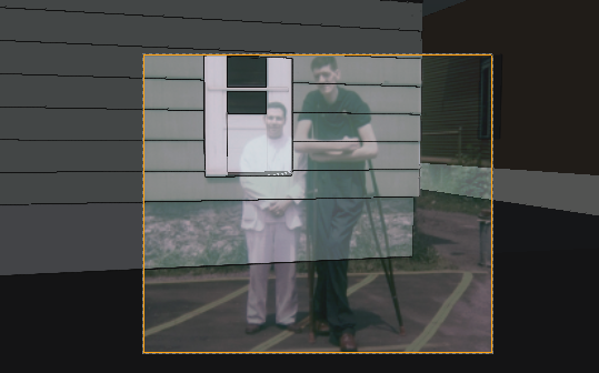 Fig 8. A 3D scene of the street and the two houses visible in the photograph is created from the perspective information in the photograph. Note how the 3D scene exceeds the photo. Click on image to view larger