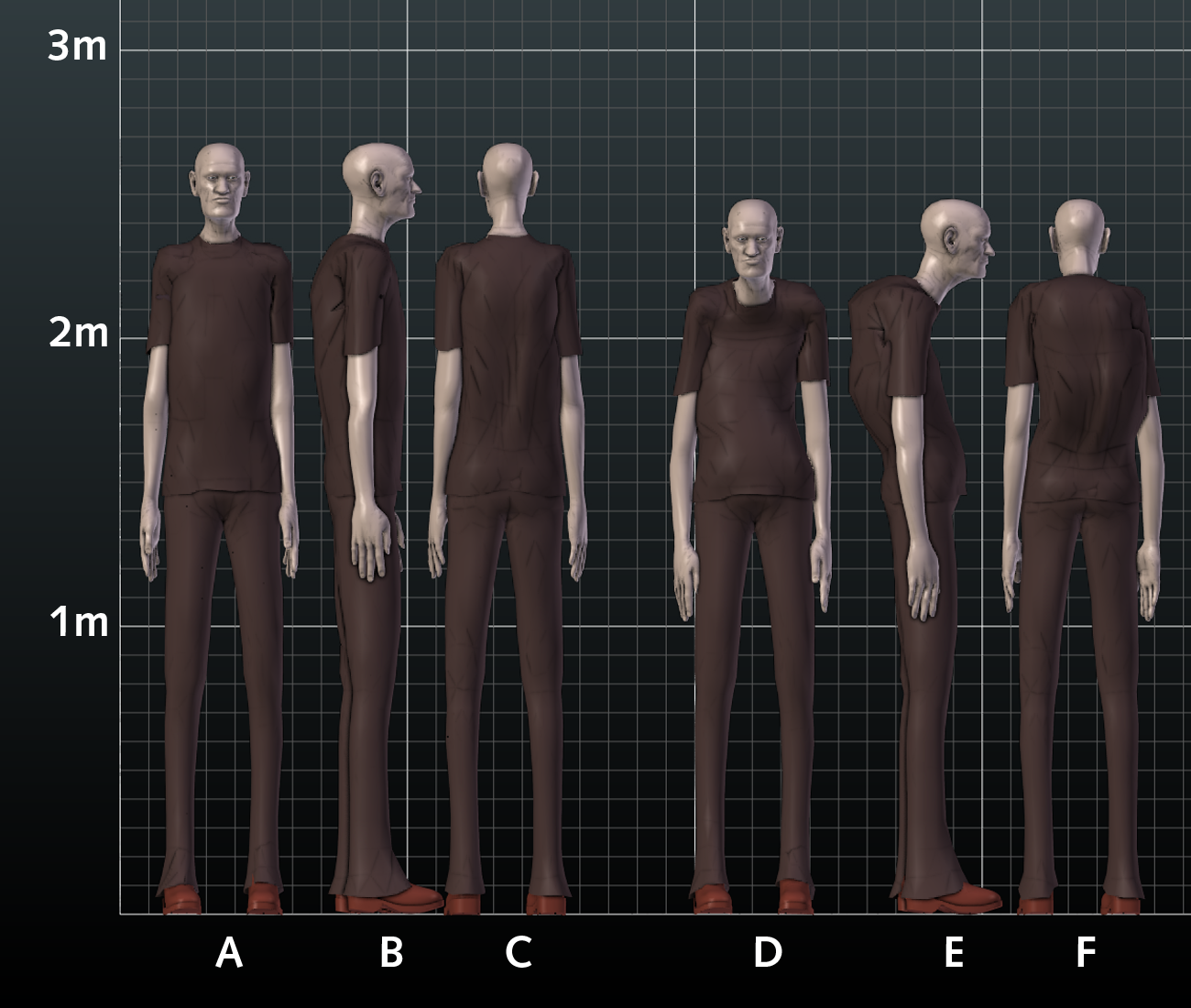Fig 15. Comparison between 3D human giant model with normal spine curvature at at a height of 8’7.75” (263,5 cm) and with curved spine resulting in a height of 8ft (243,8 cm). Please note that he models are wearing 2″ (5 cm) high shoes that adds to the height. A) Normal spine frontview. B) Normal spine sideview. C) Normal spine rearview. D) Curved spine frontview. E) Curved spine sideview. F) Curved spine rearview. Click on image to view larger