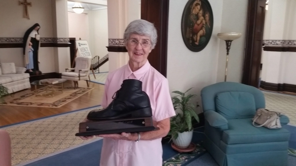 Fig 14. Original caption: “Sister Sheila Marie Walsh with the size 16 EEEE boot worn by John Francis Carroll.”(Warner, 2015). Click on image to view larger