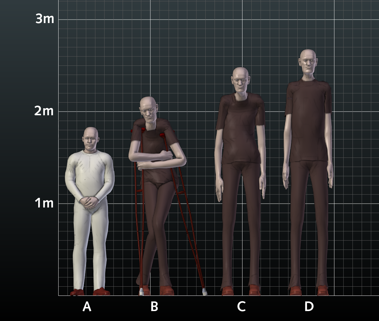 Fig 18. Frontview showing comparison between 3D human models A) 3D human modeled after Dr. Prezio in the TBN photo. B) 3D giant human based on Carrols measurements posed according to the TBN photo. C) 3D giant human based on Carrols measurements with curved spine. D) 3D giant human based on Carrols measurements with normal spine. Click on image to view larger