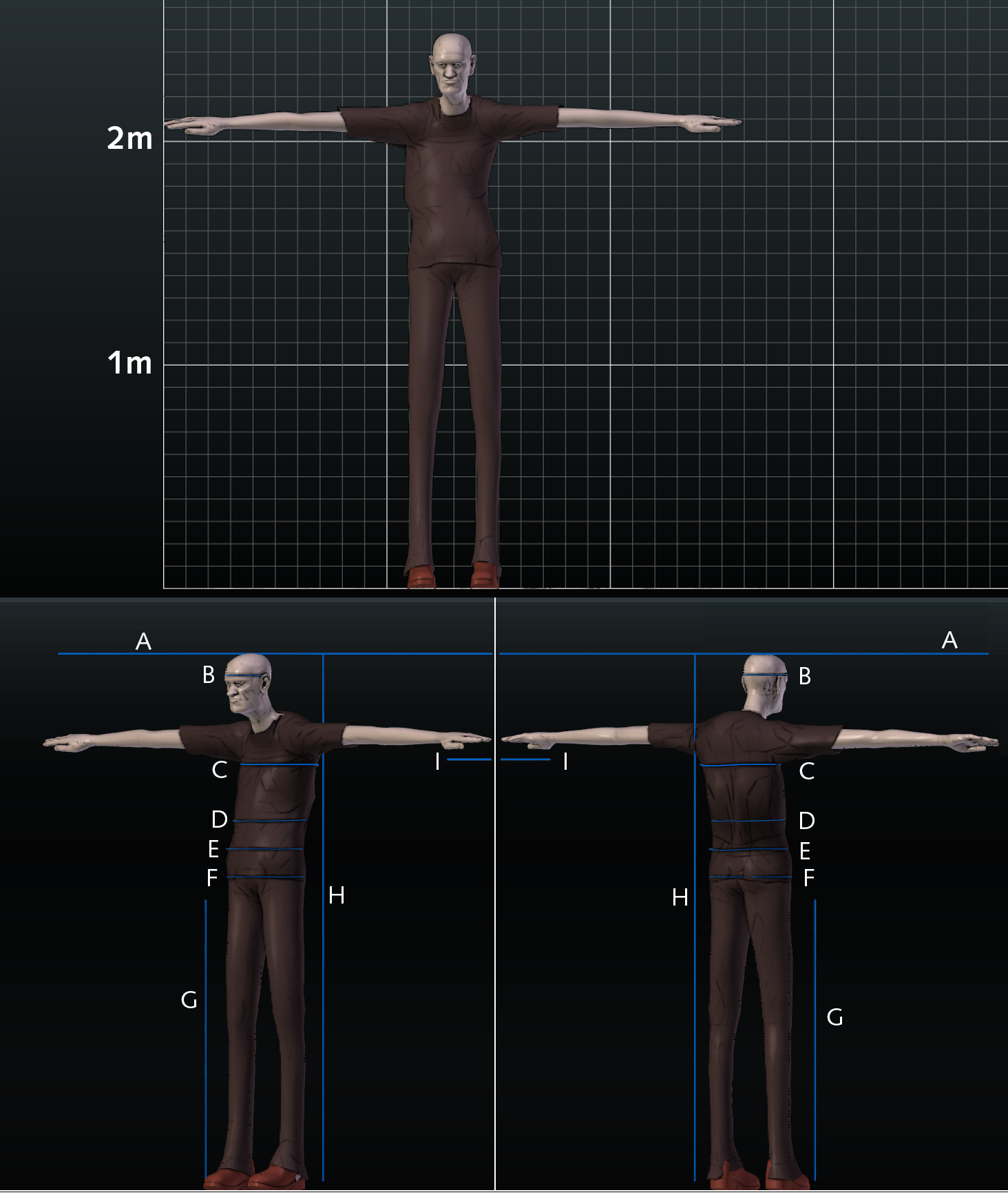 Fig 13. 3D giant human model scaled after measurements of Carroll. A) Span 102” (259,1 cm). B) Head circumference (occipital to frontal) 26” (66 cm). C) Chest at mammary line 45” (114,3 cm). D) Circumference at umbilicus 40.5” (102,9 cm). E) Circumference at iliac crest 42.5 ” (107,9 cm). F) Circumference at trochanters 43” (108,2 cm). G) Height pubis to heel 51” (129,5 cm). H) Height 96” (243,8cm). Click on image to view larger
