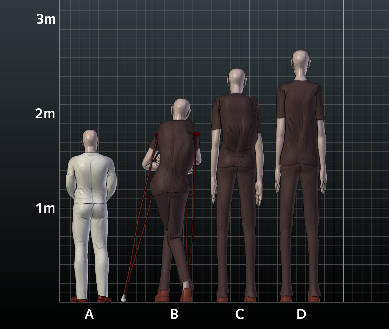 Fig 20. Rearview showing comparison between 3D human models A) 3D human modeled after Dr. Prezio in the TBN photo B) 3D giant human based on Carrols measurements posed according to the TBN photo. C) 3D giant human based on Carrols measurements with curved spine. D) 3D giant human based on Carrols measurements with normal spine. Click on image to view larger