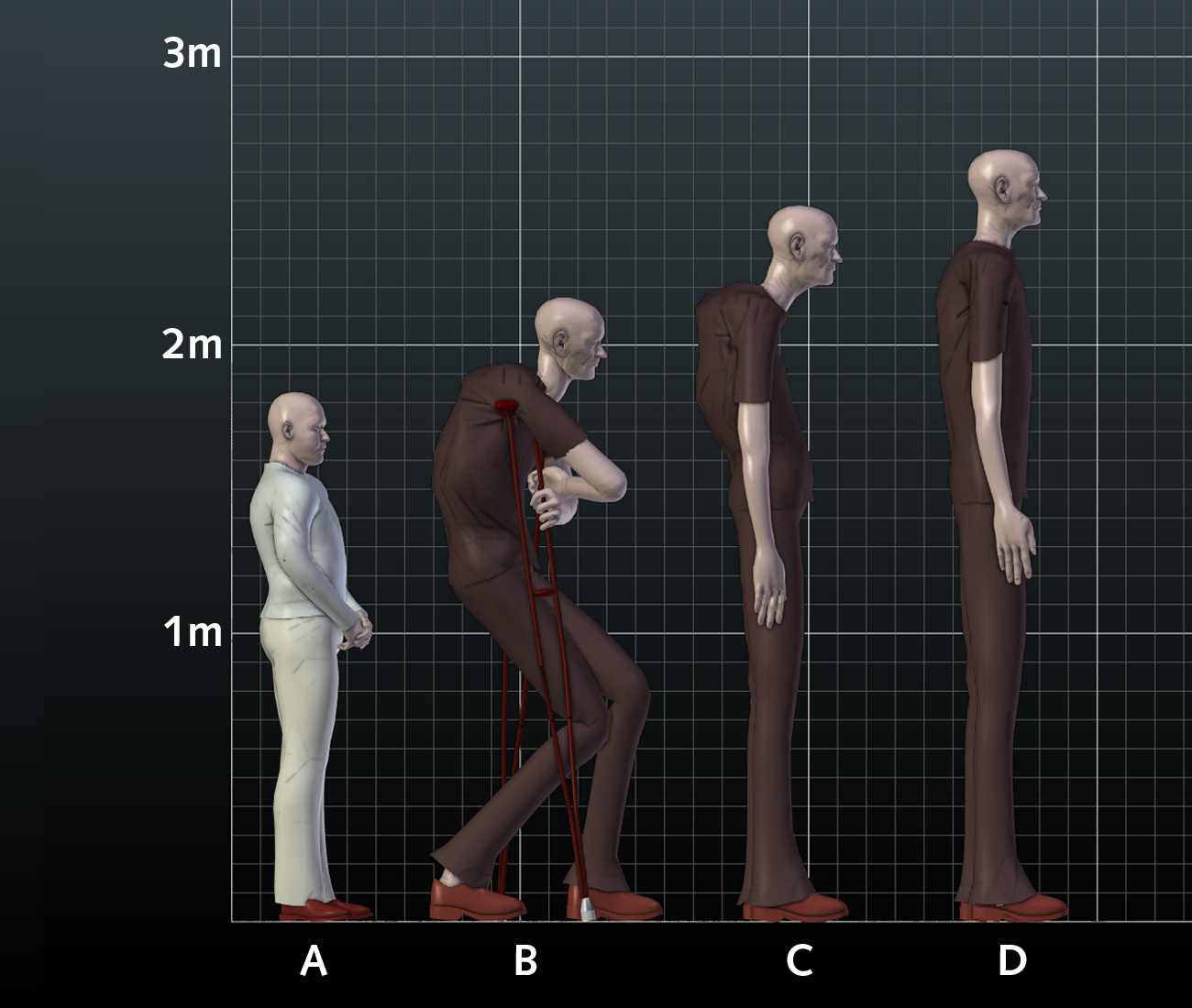 Fig.19. Sideview comparison between 3D human models A) 3D human modeled after Dr. Prezio in the TBN photo. B) 3D giant human based on Carrols measurements posed according to the TBN photo. C) 3D giant human based on Carrols measurements with curved spine. D) 3D giant human based on Carrols measurements with normal spine. Click on image to view larger
