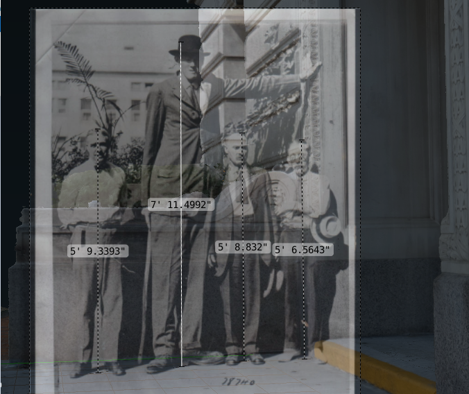 Fig 12. The estimated heights (in shoes) for the four men in the photograph. From left: E.D Van Meter, 5’9.3” (176,0 cm), Bernard Coyne, 7’11.5” (242,6 cm), Sylvester Coyne (Bernards father), 5’8.8” (174,7 cm), Sam Wymer, 5’6.6” (169,1 cm). Click on image to view larger.